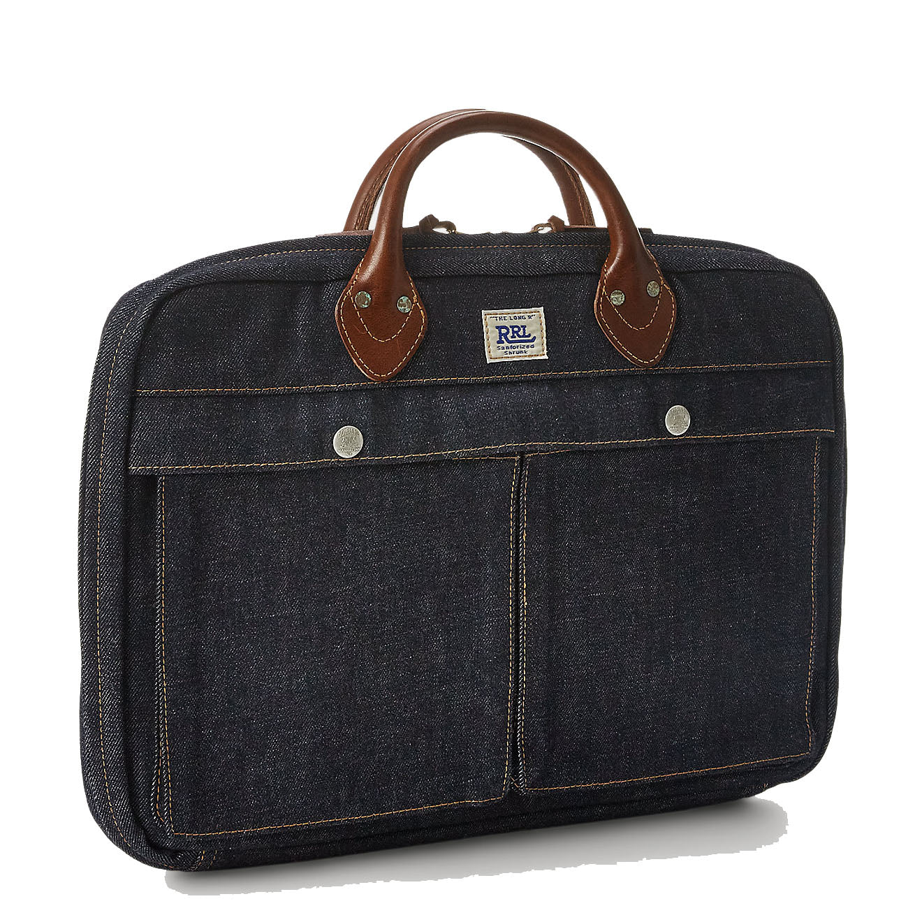 Leather-Trim Denim Briefcase from RRL by Ralph Lauren made with indigo-dyed denim that will fade over time with use. "The Long R' RRL" label on the front. Leather handles and trim. Padded laptop sleeve at the interior. Self-lined. Brass zip with zip-around opening so bag can lay flat. Distressed copper-tone rivets.