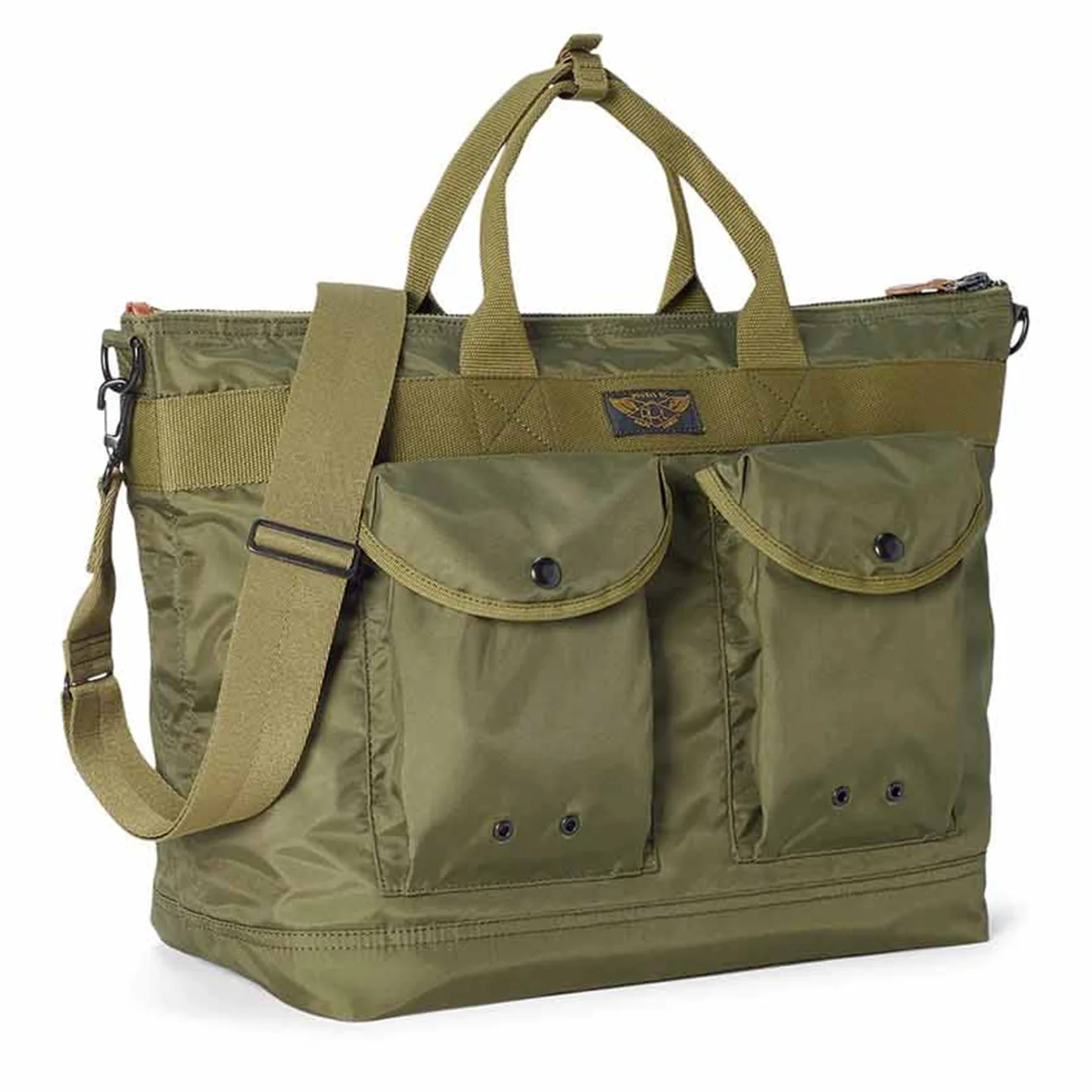 The Nylon Canvas Utility Messenger Bag in Olive Drab from RRL by Ralph Lauren is Constructed from durable yet lightweight recycled nylon canvas. Webbed top handles and removable shoulder strap. Self-lined. Leather zip pulls. Solid brass hardware with a black oxidised finish.
